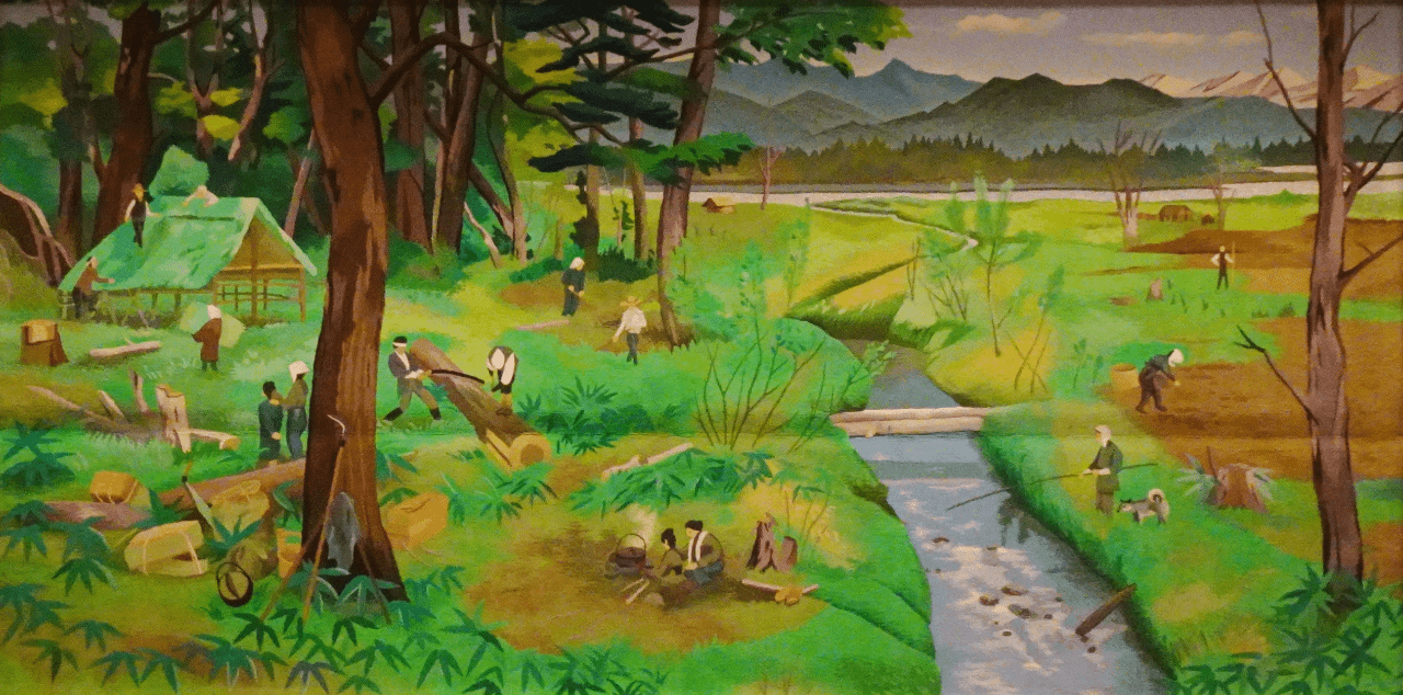 ~明治中期の上川地方の開墾風景を描いた図(ビジターセンター講堂 緞帳)~