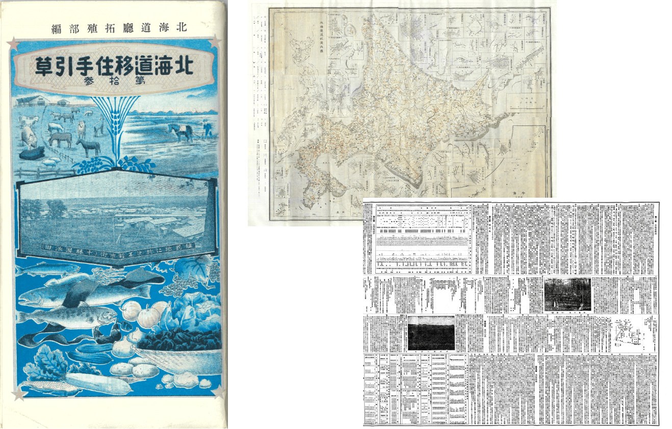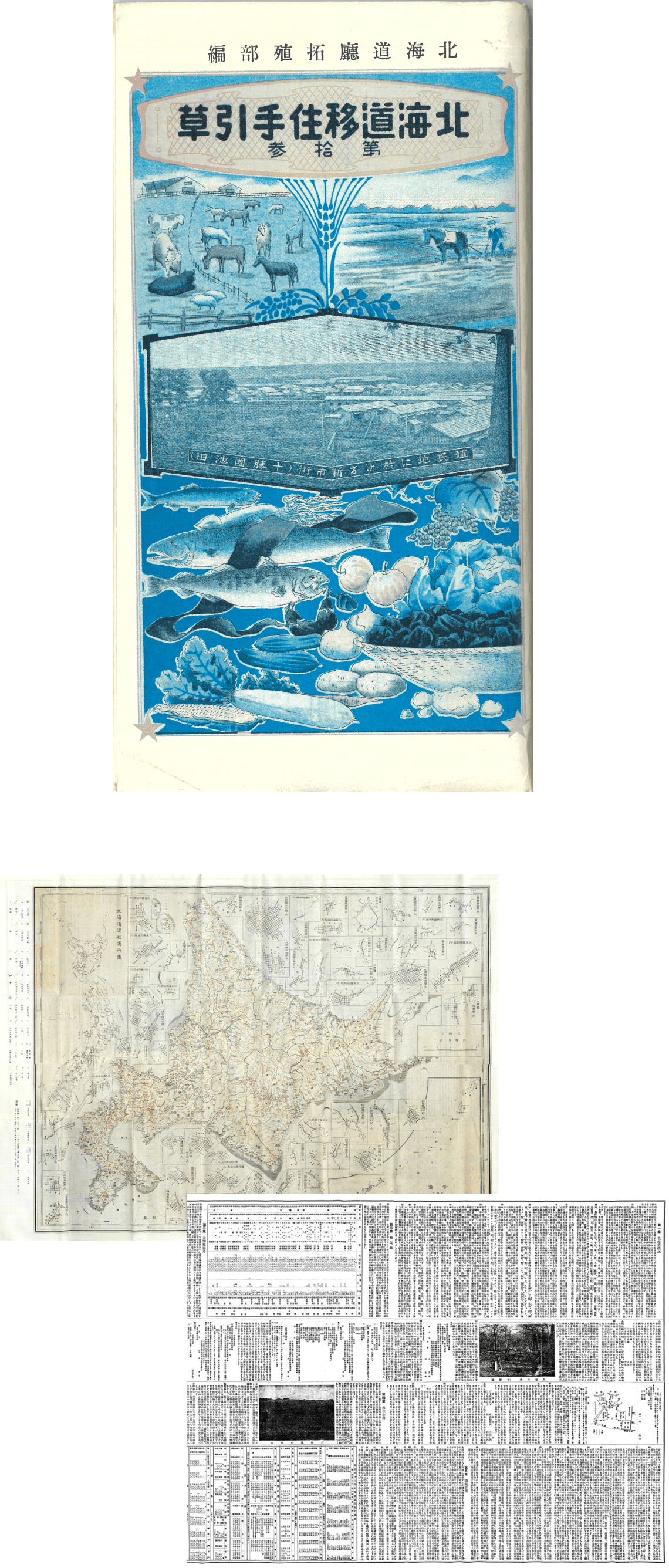 また、北海道庁は、移住に関する情報を広めるため、表紙を北海道の情景や産物で飾り、北海道の概況や土地取得の手続きなどをまとめた「北海道移住手引草(明治33(1900)年に北海道移住案内を改題したもの)」などを発行し、府県や町村を通して大量に配布しました。