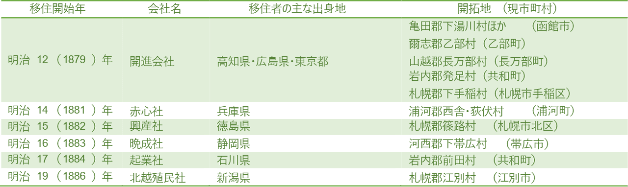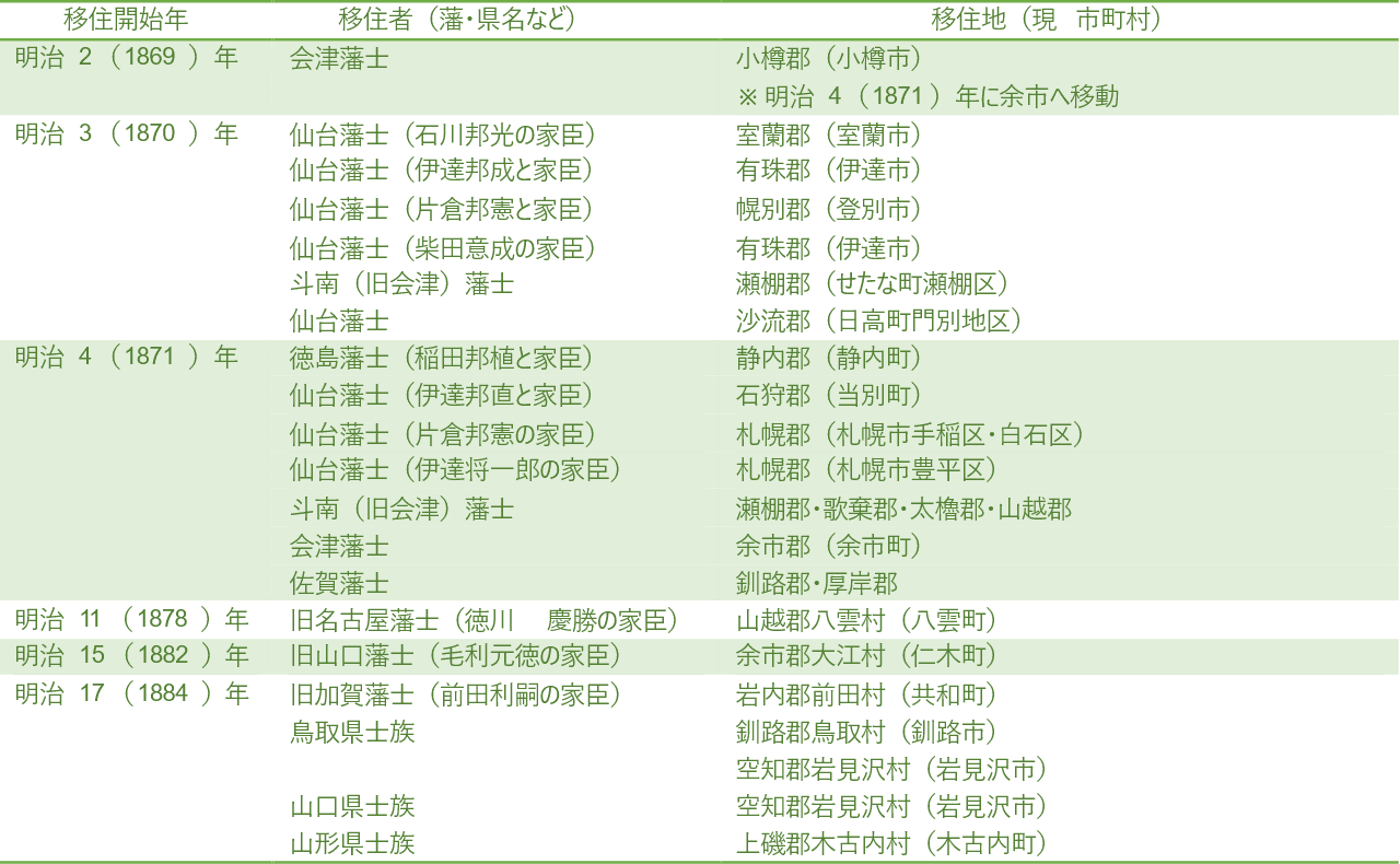 明治初期には、明治維新で新政府と対立し、領地を失った旧会津藩・仙台藩など、東北地方の士族たちが多数北海道に移住しました。彼らは旧領主を中心に集団で移住し、主従の固い結束のもとに、開拓を成功に導きました。