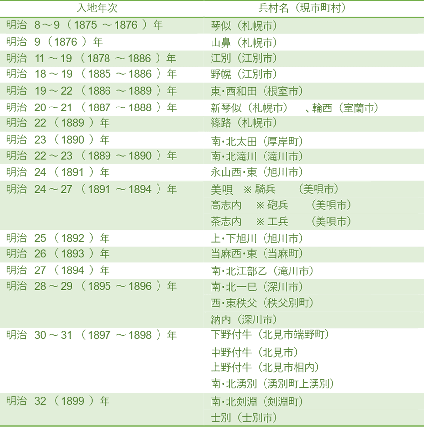明治8(1875)年から同32(1899)年までに道内各地に37の中隊(兵村)が配置され、7,337戸、家族を合わせると約4万人が入植しました。明治23(1890)年までは士族、そのあとは平民が主体でした。本州で移住希望家族を募集し、適格者は現地までの旅費・支度金が与えられ、さらに兵屋と給与地のほか、3年間は米や塩菜料などが支給されました。彼らは厳しい規律のもとで、開墾・営農と軍事訓練に励みました。