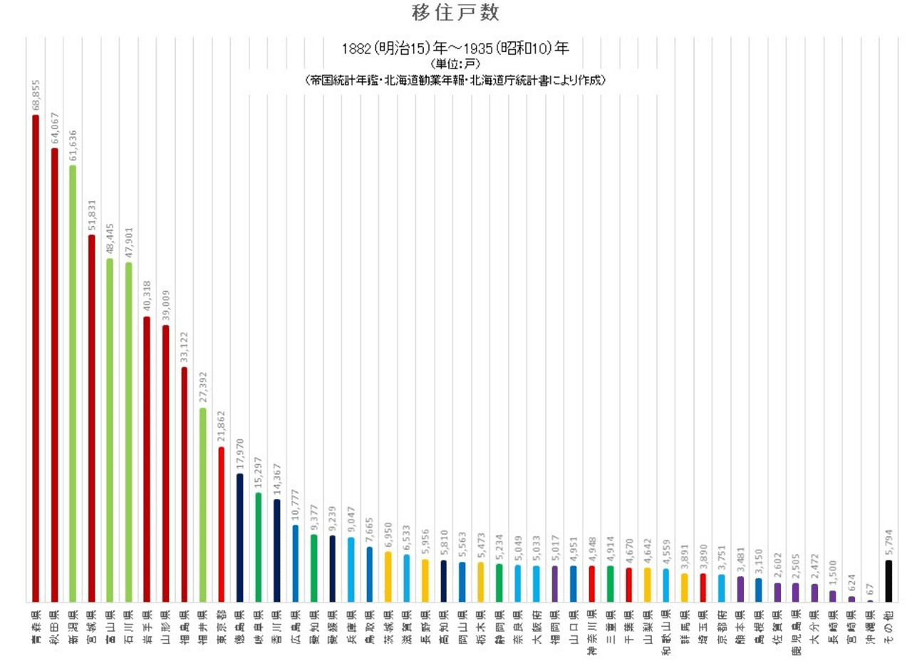 北海道移民の出身地(府県)は全国に及んでいますが、明治15(1882)年~昭和10(1935)年の移住戸数を見ると、青森県が最も多く約68,900戸、2位が秋田県の約64,000戸、3位が約61,600戸の新潟で、以下、宮城、富山、石川、岩手、山形、福島、福井が上位を占め、東北・北陸地方の出身者が全体の67%以上に達していました。